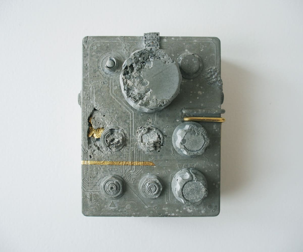 予め欠損を施したモルタル製の造形物に、金箔や真鍮などの装飾で欠損箇所を補うことで複合美を表現した作品。