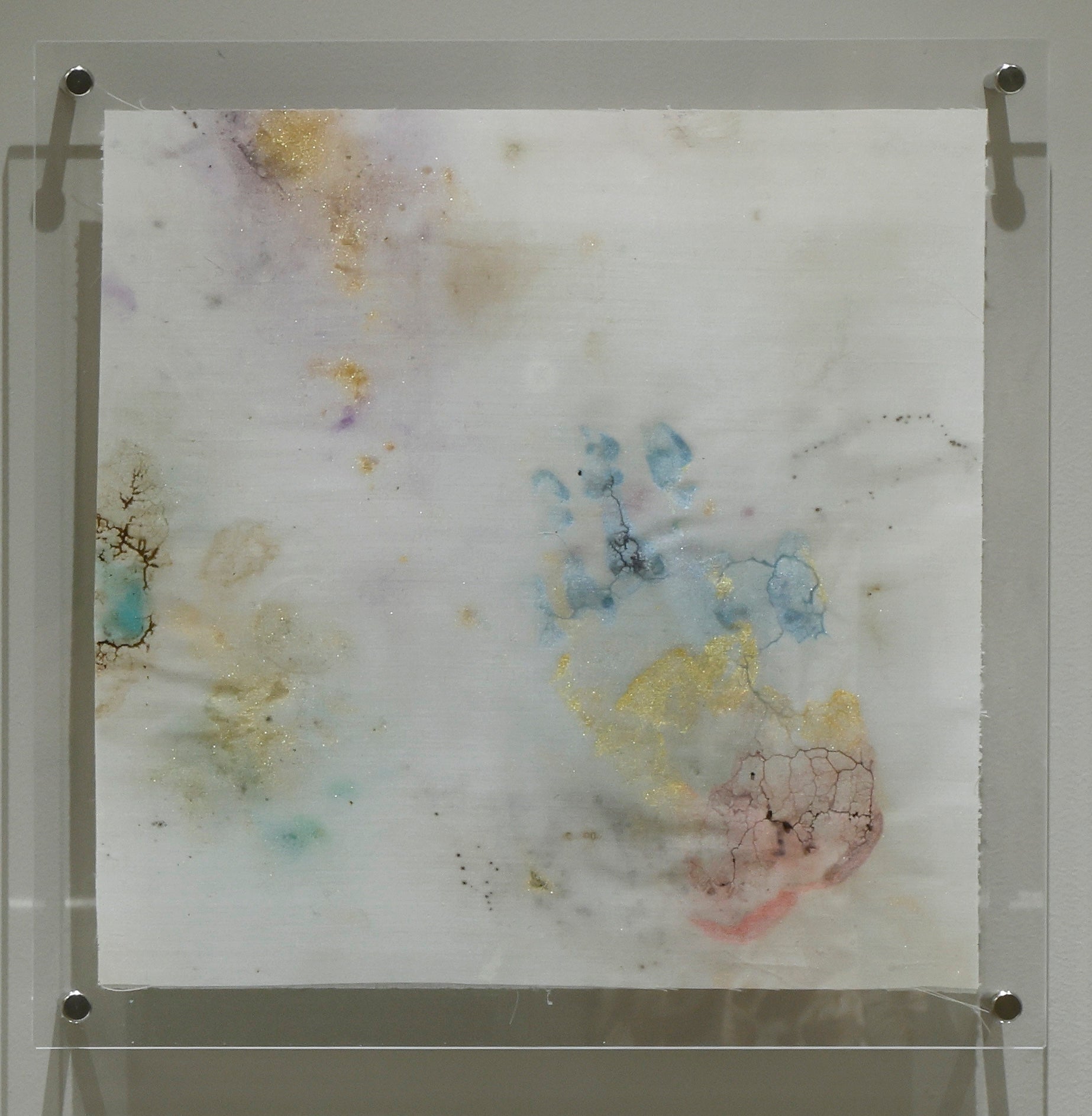 素材:絹布、真正粘菌(イタモジホコリ、斑山採取株)、食用グリッター、オートミール粉、アクリルパネル